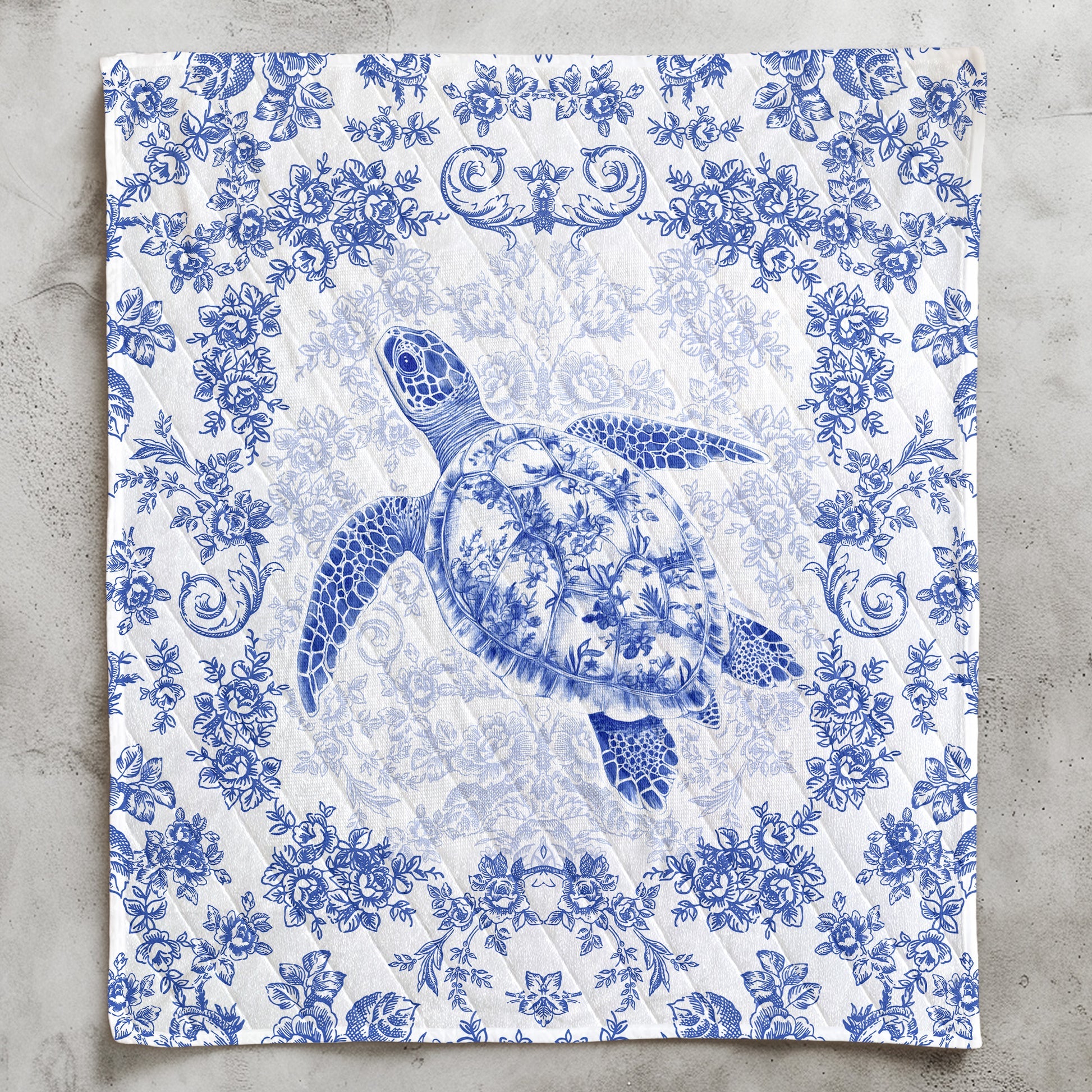 This quilt set combines decorative vintage styling with personalized details to create a bedding look that feels unique to you. The sea turtle artwork sits at the center of the design, framed by elegant floral toile-style patterns, while the matching pillowcases can be customized with your chosen name. The result is a bed setup that feels thoughtful, stylish, and made with intention.